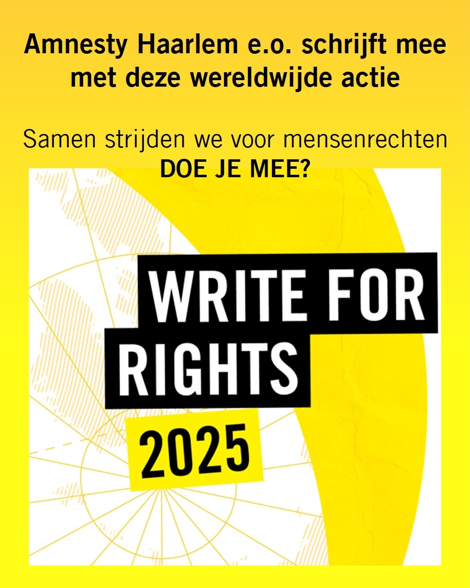 Rond 10 december – de Dag van de Mensenrechten – schrijven mensen over de hele wereld samen brieven voor negen verschillende mensen of groepen. Daarnaast steunen we de activisten en hun families met hoopvolle kaartjes. Zo houden ze de moed om door te gaan. Ook in Haarlem doen we weer mee met de Write for Rights actie. Zie onze agenda voor de lokaties van alle schrijfacties en de website van Amnesty Nederland voor meer informatie over de Write for Rights actie.